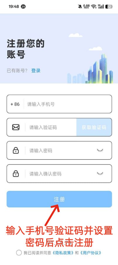 进入注册页面输入手机号码接收验证码,设置密码后,点击注册确认进入